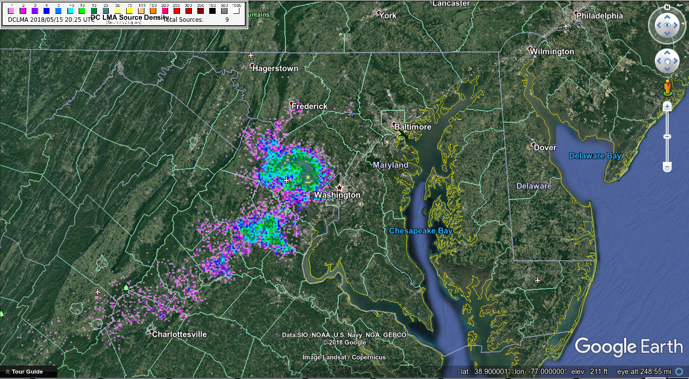 Download the file DCLMA_realtime.kml and open it in Google Earth to overlay the most recent ten minutes of DC LMA data on Google Earth. The image will automatically update once a minute.